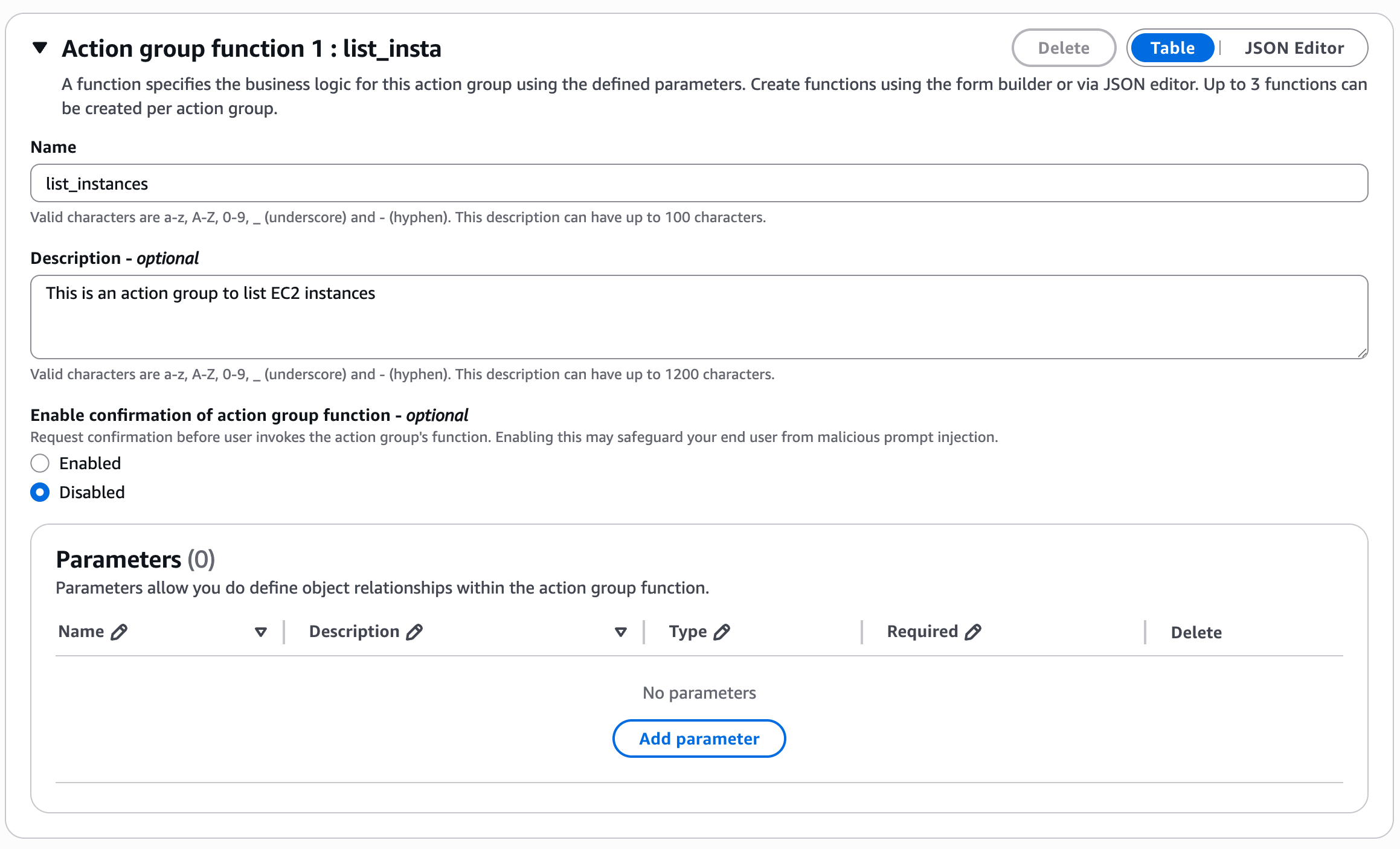 list_instances – function name, as I mentioned previously – you can have multiple functions per each action group