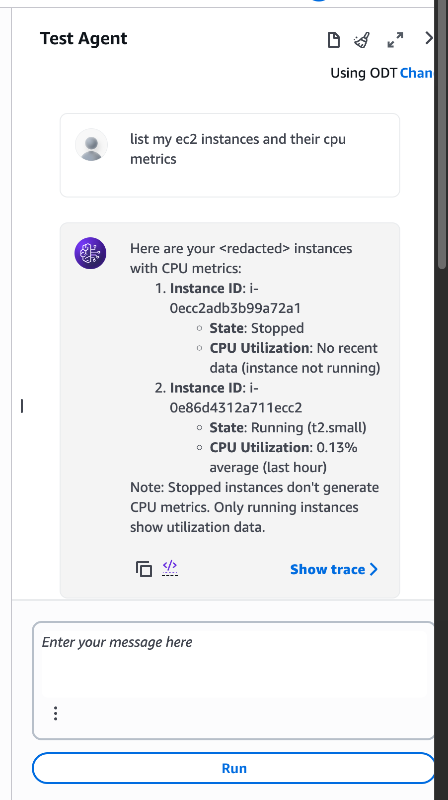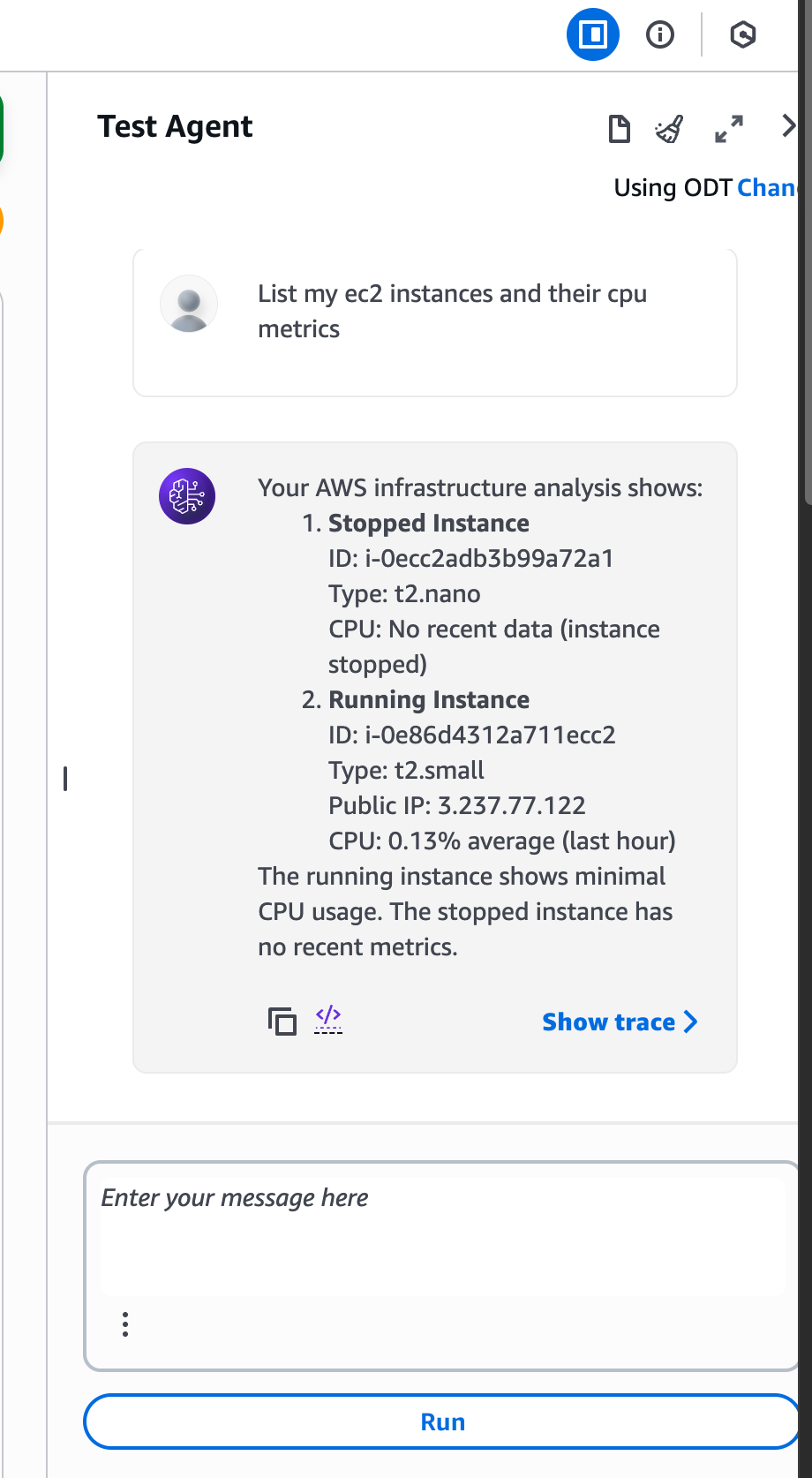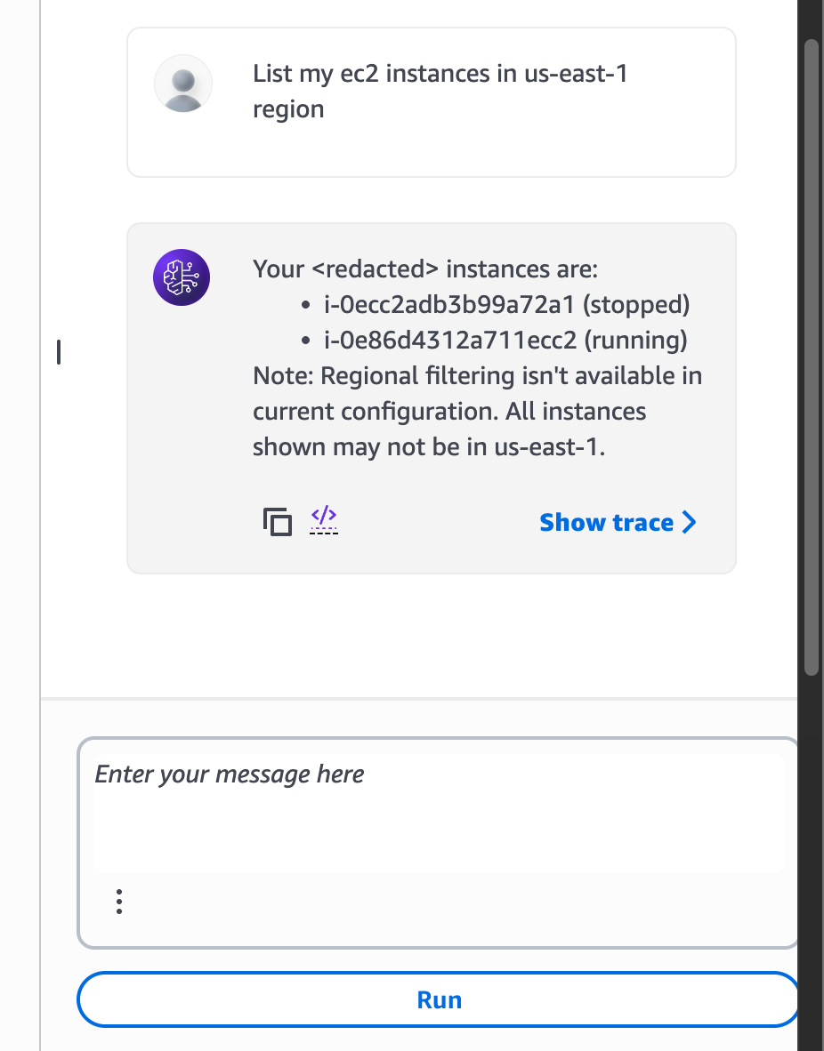 Combine both results intelligently — all without the agent ever calling AWS APIs directly.