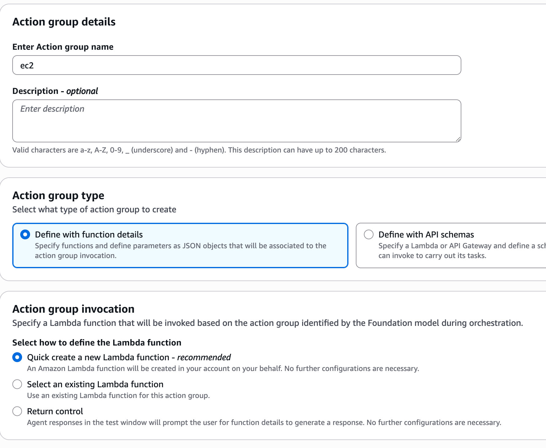 Name – EC2. Action group. invocation – create a new lambda function, where list_instances must be the same as we defined in the agent instructions