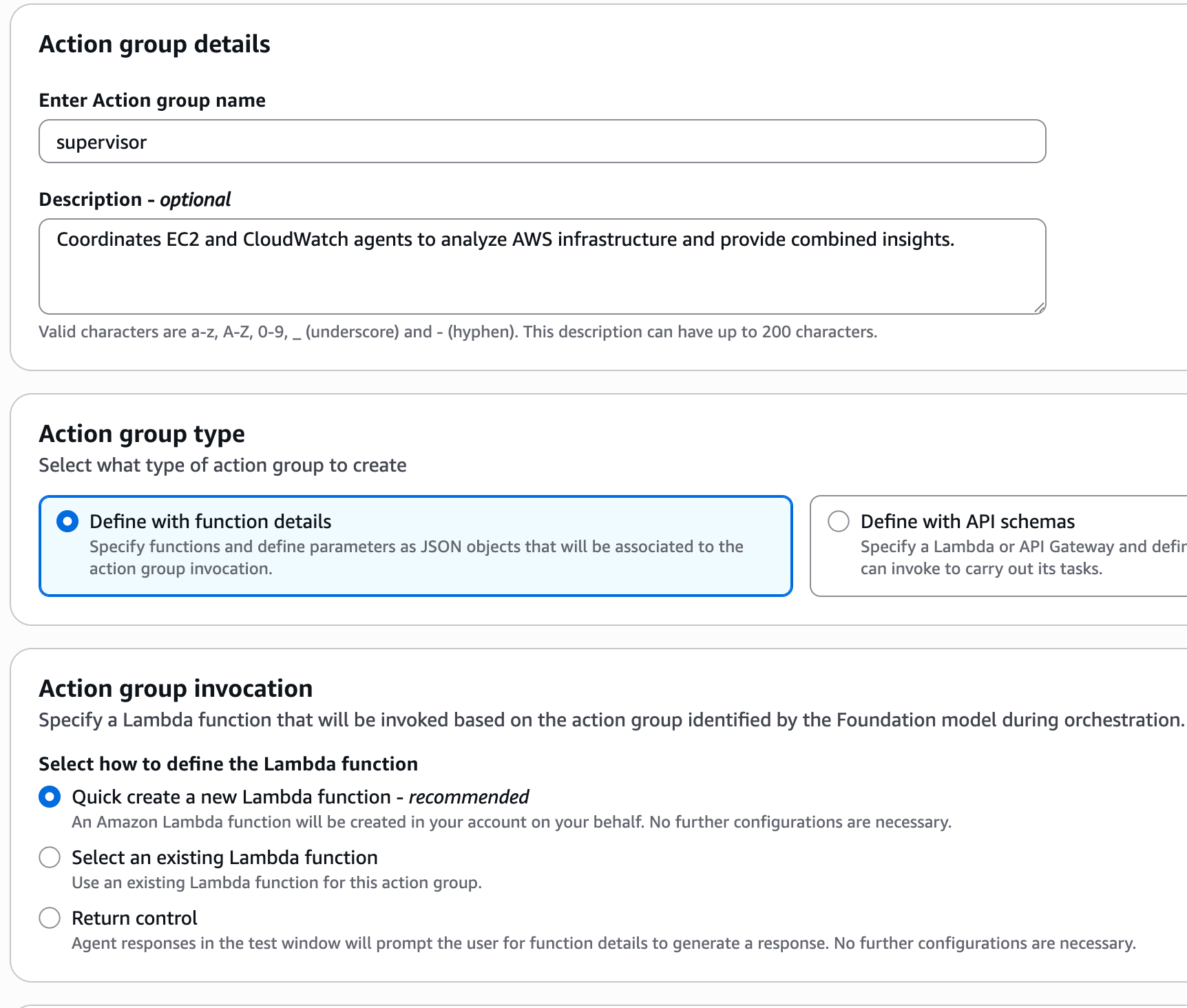We have EC2 and CloudWatch action groups, and they can be called from the agent to get a list of EC2 instances and their CPU metrics. Now, let’s add a Supervisor function to make this process smarter and more efficient.