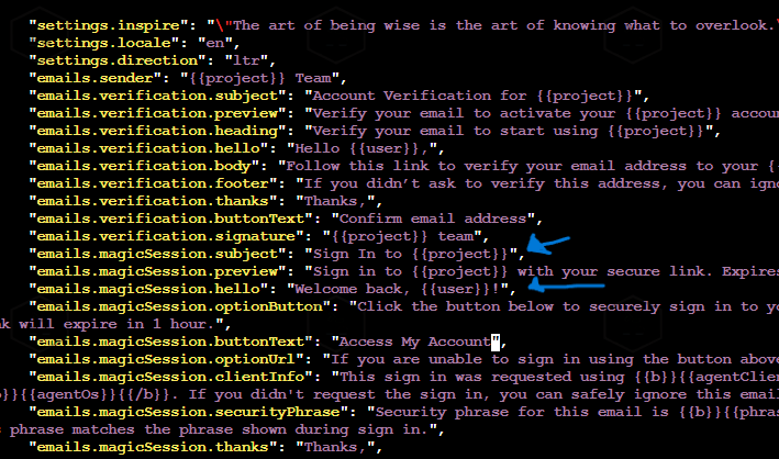 {{project}}– Your project name{{user}}– User’s name or email{{b}}...{{/b}}– Bold text markers{{redirect}}– The action URL{{agentClient}}– Browser/client info{{agentDevice}}– Device type{{agentOs}}– Operating system{{phrase}}– Security phrase for verification