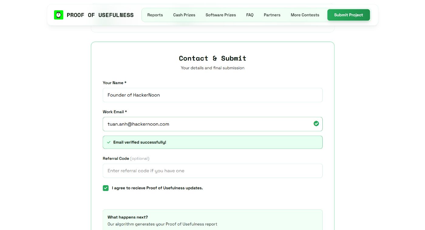 All done? Great! Hit “Submit Project” and wait. The system will analyze your inputs (including traction metrics like users or stars) and generate a Proof of Usefulness Score (-100 – 1000+) along with a downloadable report card.