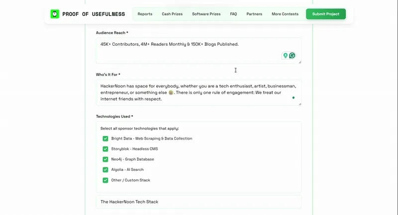 Before you submit, pull together simple traction proof like ==active users, API calls, paid customers, or GitHub stars/forks if you’re open source, and the specific integrated tech stack (Bright Data, Neo4j, Storyblok, Algolia, or your custom stack)==. This ensures your product’s usefulness is easy to verify and not just implied.