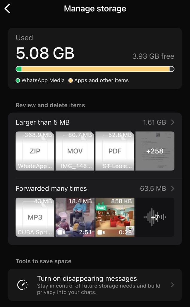 • Chat-specific cleaning: Scroll down to see a list of chats arranged by size. If a specific group chat is occupying 2GB of space, you can tap on it and delete just the media from that specific conversation while keeping the text messages intact.