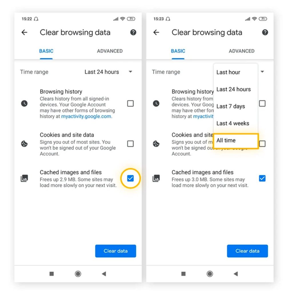 Android provides manual control over temporary app files. The system allows control over cache or temporary files in two ways:
