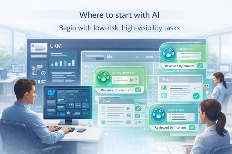 A calm, incremental approach is what separates successful AI integration from projects that create stress and confusion. The core principle is simple: AI should be introduced as an assistant, not a replacement. When AI is positioned as support, it strengthens existing teams instead of competing with them. In customer support, this means AI can draft responses, categorize tickets, and flag urgent cases, while humans remain responsible for final approval. In sales, AI can clean CRM data, summarize conversations, and highlight missing follow-ups, but the human still owns the relationship and the decision-making. This keeps control where it belongs and allows trust in the system to grow naturally.