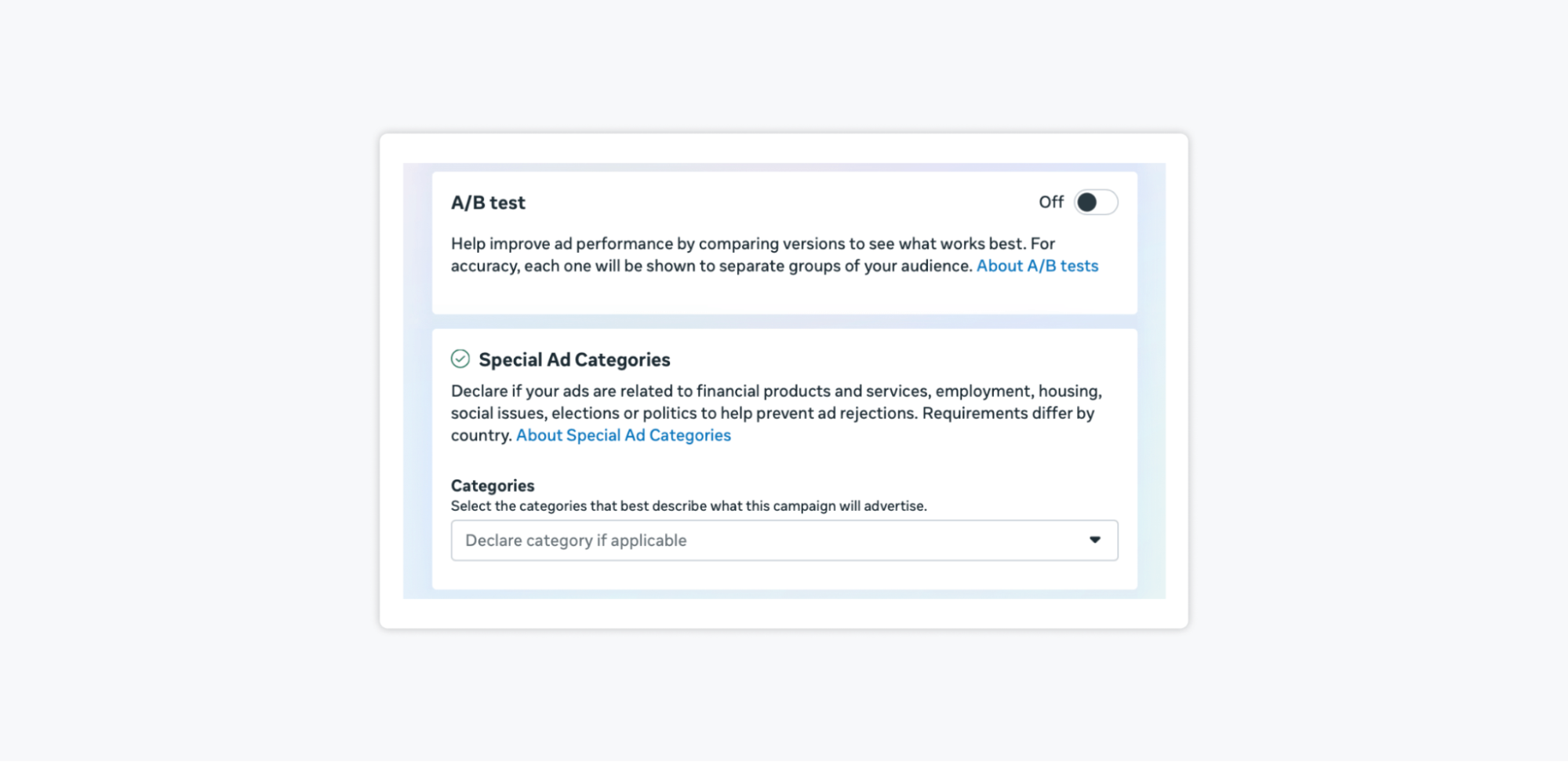 Step 6: Configure A/B testing and special ad categories. Decide if you want to run an A/B test, which allows you to compare different ad versions for performance insights. Then, confirm whether your campaign falls under Special Ad Categories (like housing, employment, credit, or political content). If it doesn’t, you can leave this section blank and continue.