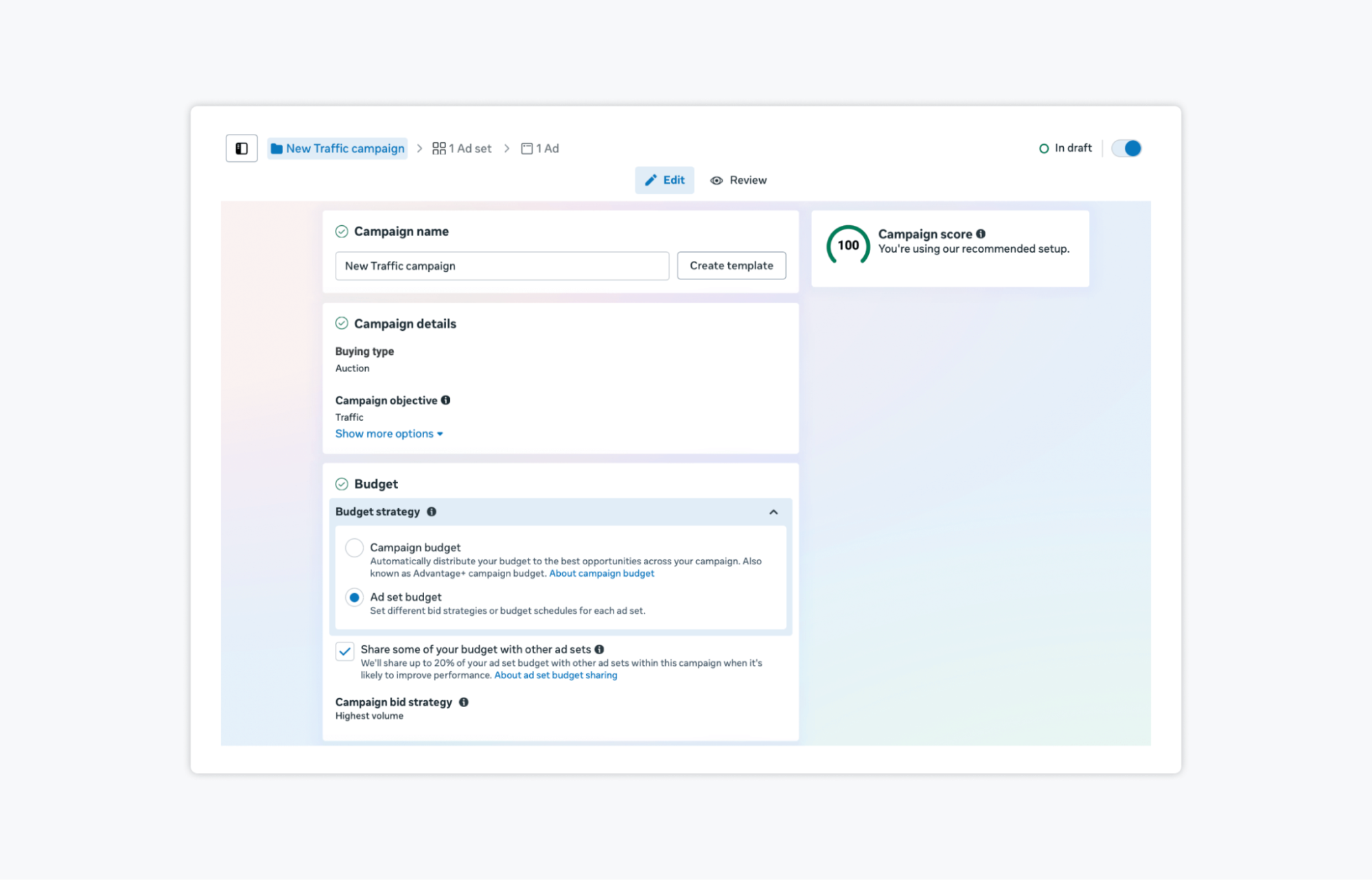 Step 5: Name your campaign and budget. Give your campaign a clear name (so it’s easy to track later), confirm your buying type and objective, then choose your budget strategy. Agencies often prefer an Ad set budget, which lets you control spend for each audience you’re testing, rather than spreading it automatically across the campaign.