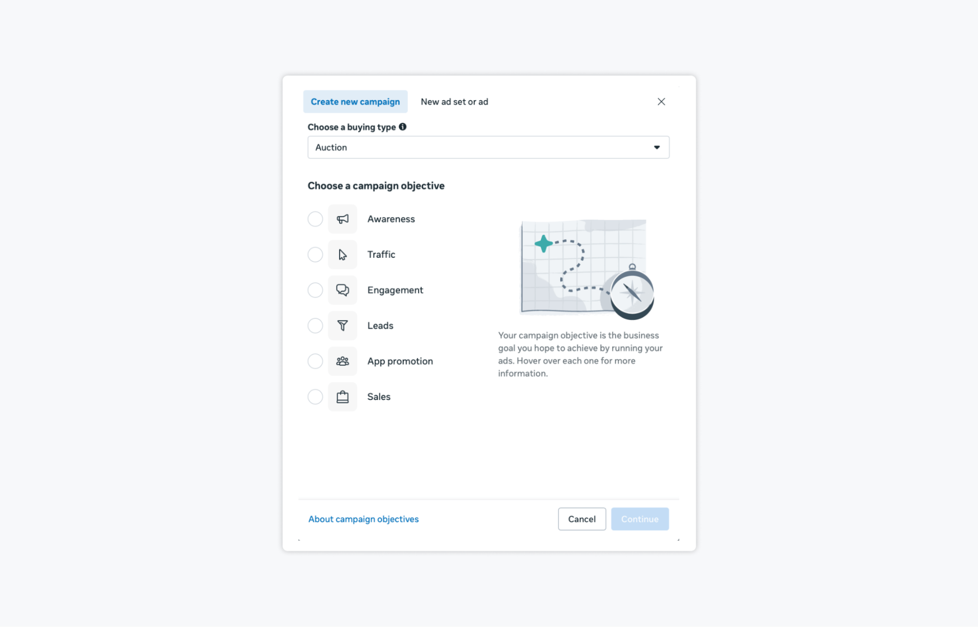 Step 3: Select a campaign objective that aligns most closely with your client’s goals (or what you agreed on). For example, if they want more newsletter sign-ups, pick Leads. If they’re focused on driving purchases, go with Sales.