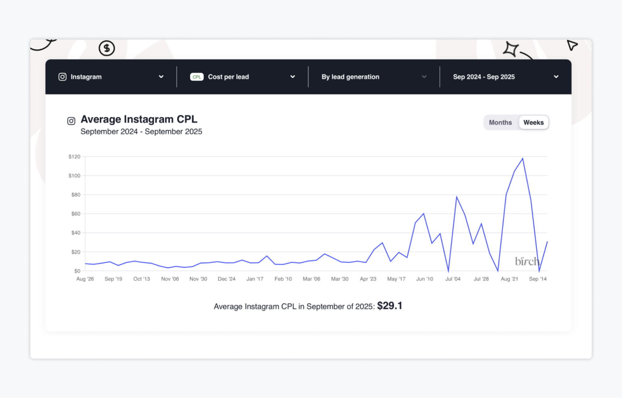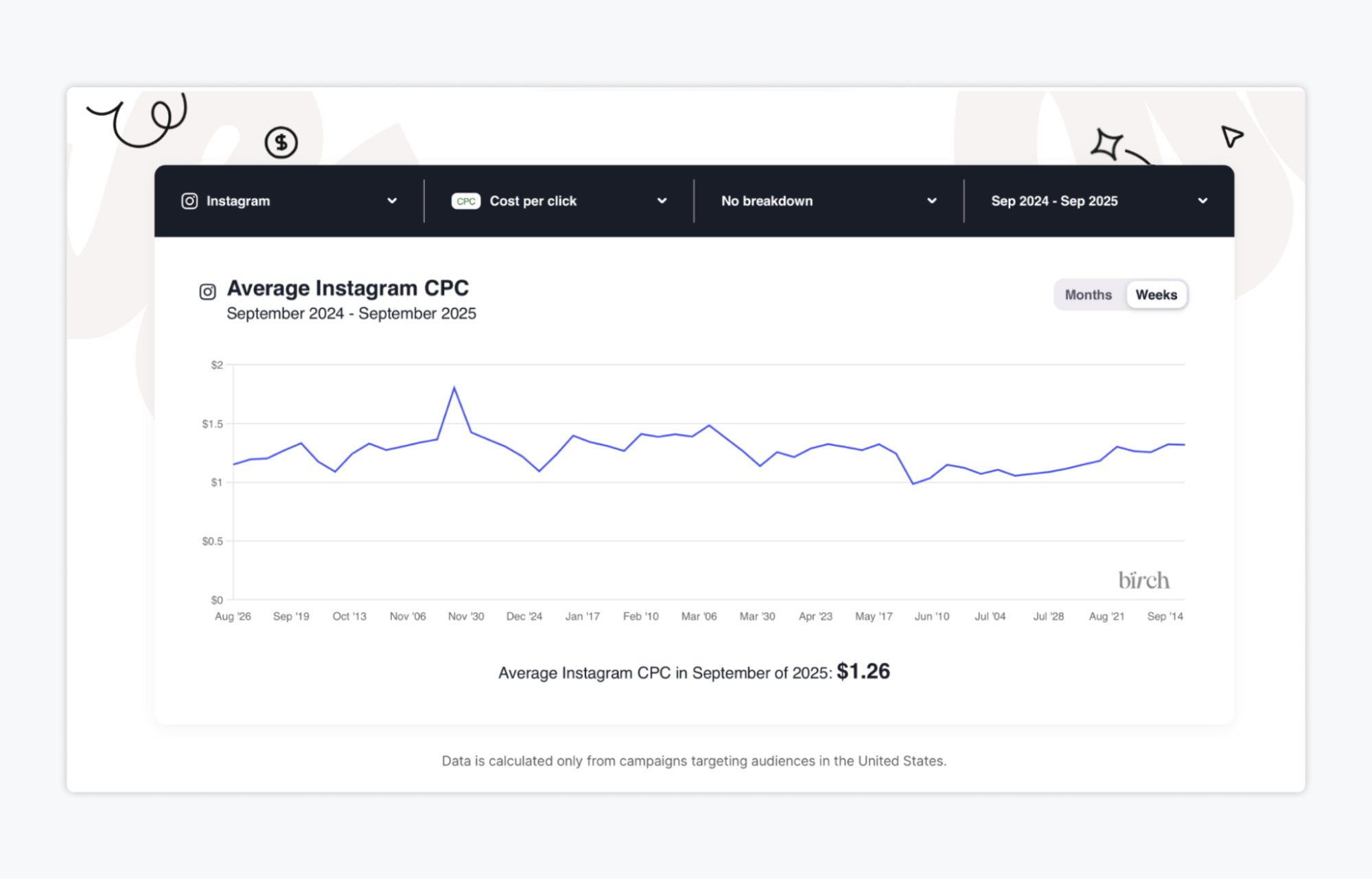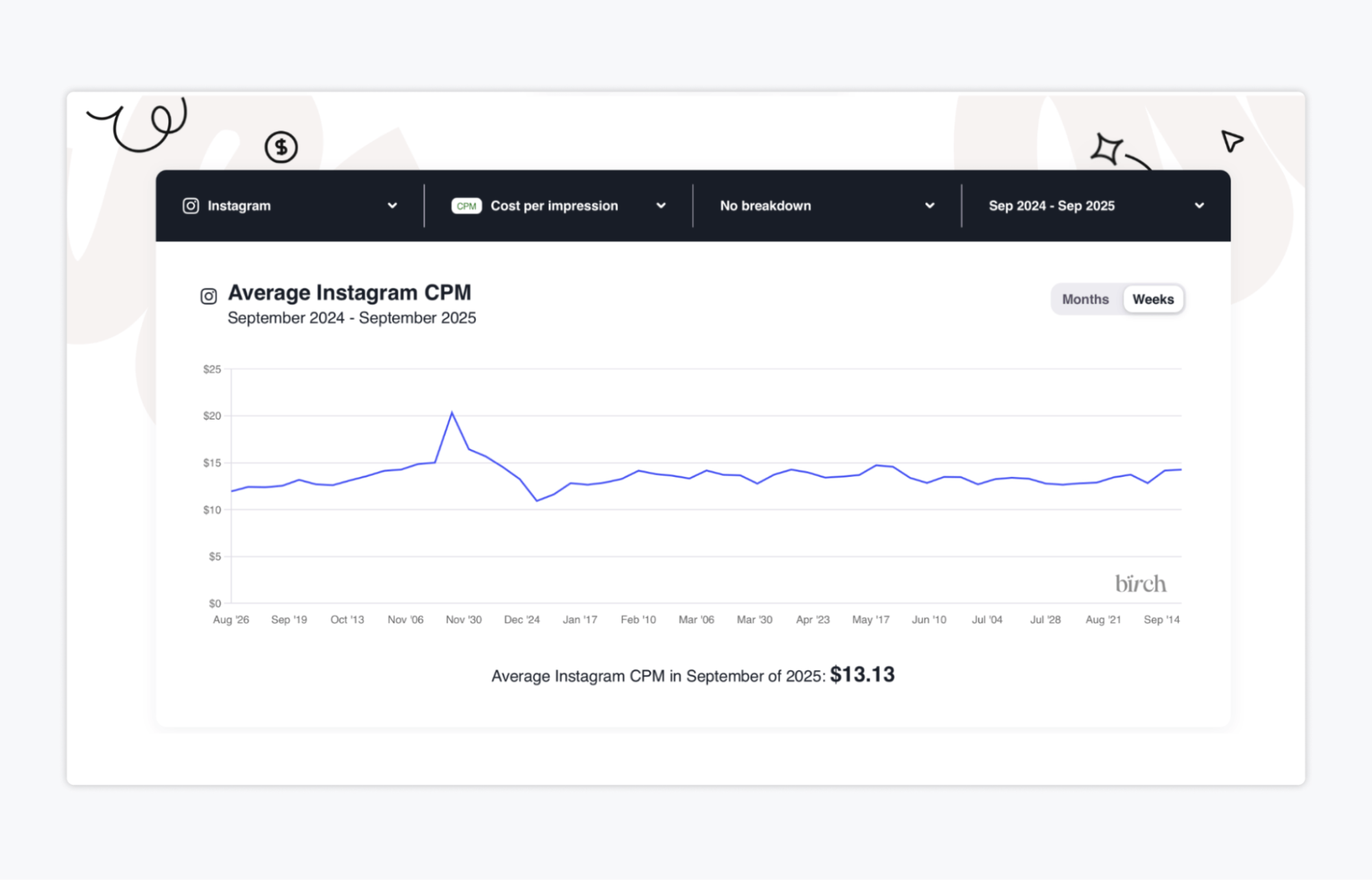 According to Birch data for September 2025, the average Instagram CPM (cost per 1,000 impressions) is $13.13, the average CPC (cost per click) is $1.26, and the average CPL (cost per lead) is $29.10. Costs vary depending on your audience, objective, and creative quality. Stronger-performing ads typically cost less to deliver.