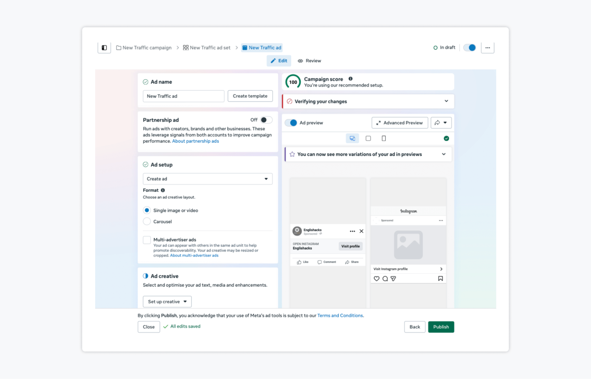 Step 8: At the ad level, you’ll decide what your audience will actually see. Start by naming your ad, then either select an existing Instagram post or create a new one. Choose your format (single image or video, carousel, or multi-advertiser), upload your approved creative and copy, and set up tracking with URL parameters or conversion events. Use the Ad Preview panel to check how your ad will look across placements, then hit Publish to go live.