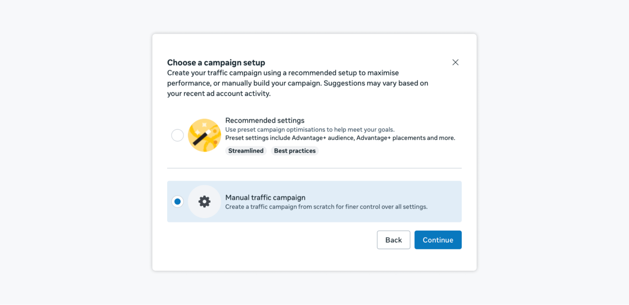 Step 4: Choose your campaign setup. Meta will ask if you want to use Recommended settings (automated Advantage+ options) or create a Manual campaign for full control. Agencies should usually pick the manual setup so you can define audiences, placements, and budgets yourself. Click Continue to move forward.