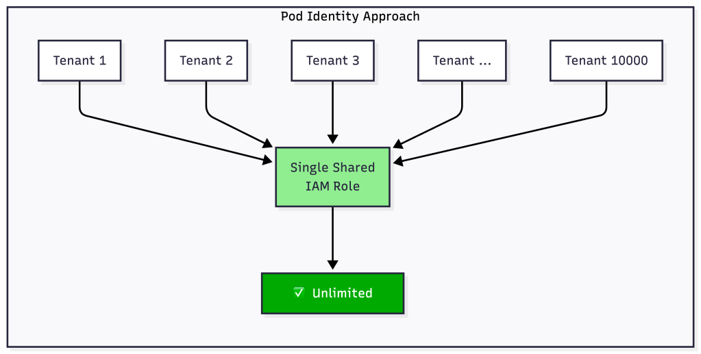 EKS Pod Identity, introduced in late 2023, fundamentally changes this equation. Instead of requiring one IAM role per tenant, you can use a single shared IAM role for all tenants while maintaining strict security isolation through namespace-based access controls.