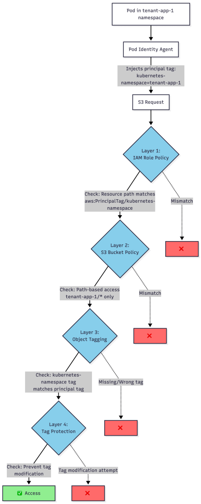 The key innovation is the automatic injection of principal tags by the Pod Identity agent. When a pod assumes an IAM role through Pod Identity, AWS automatically adds the pod’s namespace as a principal tag (kubernetes-namespace). This tag can then be used in IAM and S3 bucket policies to enforce tenant isolation at the AWS policy level.