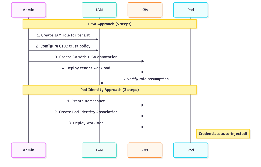 For platforms serving hundreds or thousands of tenants, the choice is clear: EKS Pod Identity eliminates the IAM role proliferation problem while actually improving security through standardized, auditable access patterns.
