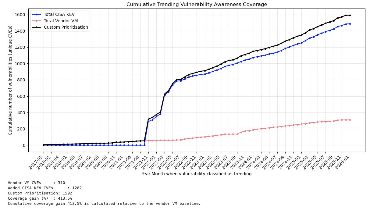 Integrating CISA KEV has led to an approximately 4.1 times (>400%) increase in awareness compared to a vendor-only approach.
