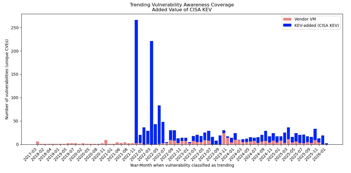• The blue segments (representing KEV-added vulnerabilities) consistently exceed the red segments (representing Vendor VM vulnerabilities) across most months. This indicates that CISA KEV identifies a significant portion of actively exploited vulnerabilities that are not captured by vendor VM platforms.