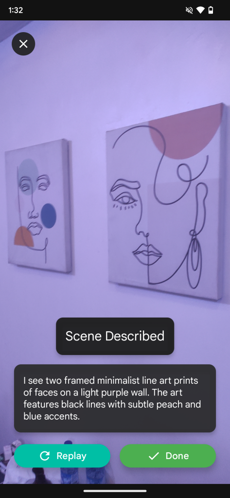 To use the feature, you hold the phone at eye level, camera facing the scene you want described, then tap to start. I first tested it in my office. I asked a colleague to describe the room, then asked the app to do the same. It accurately described the interior, noting tables arranged with chairs beside them and a clear space down the middle, which it called a “walk path.” It sounded impressive, and I tried it again in another part of the building. The description was accurate once more.