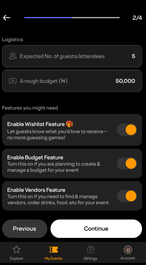 Next, the app asked for basic logistics such as the expected number of guests (I input 5 people), an estimated budget (I settled on  ₦50,000 [$34.53]), and whether I wanted extra features like a wishlist that tells attendees what I would like them to bring, a budget tracker to manage expenses, and vendor management. Now, I didn’t strictly need to onboard vendors because it was all going to be DIY barbecue, but I enabled the feature anyway.