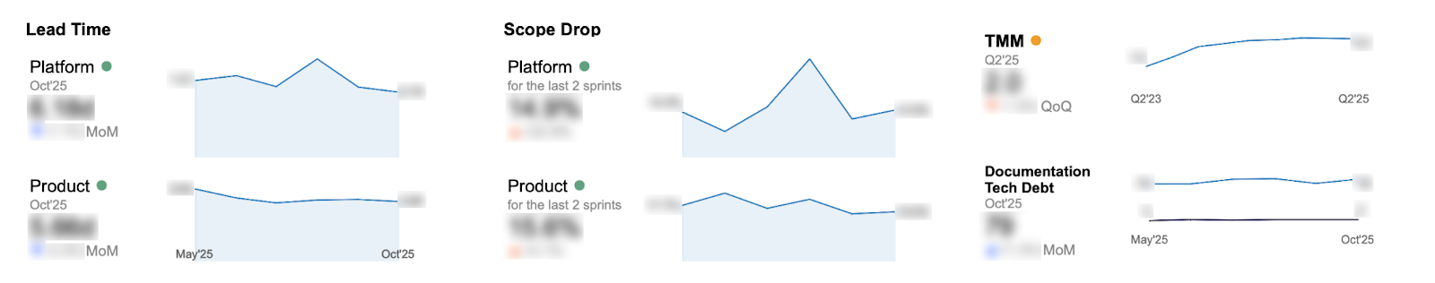 - Engineering Excellence: DORA metrics, technical debt, etc.