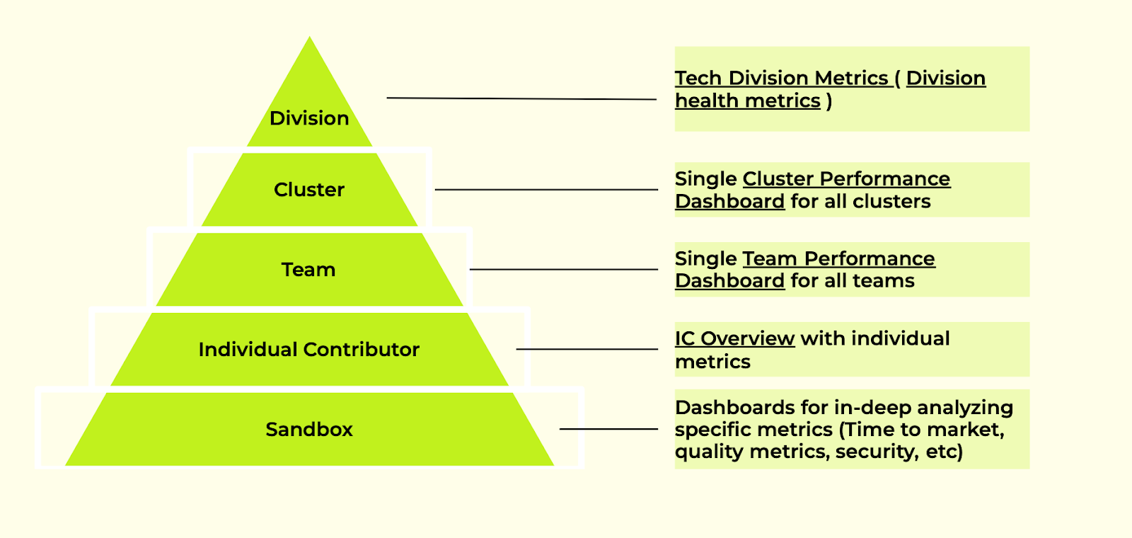 The concept behind the Single Analytical System is straightforward – it’s a set of dashboards that bring together metrics from multiple sources (Jira, Grafana, Kibana, PagerDuty, HR systems or in-house tools) into a single one-pager view. In other words, you have a pocket-sized overview of the entire landscape. And when deeper analysis is needed, you jump directly to the underlying data source, such as a detailed dashboard in Grafana. To implement the dashboards, I designed a five-tier structure: from the division level down to the sandbox. Each tier can have its own dashboard or a family of dashboards, enabling performance analysis of a specific organizational entity or providing a cross-team or cross-service view of a particular metric.