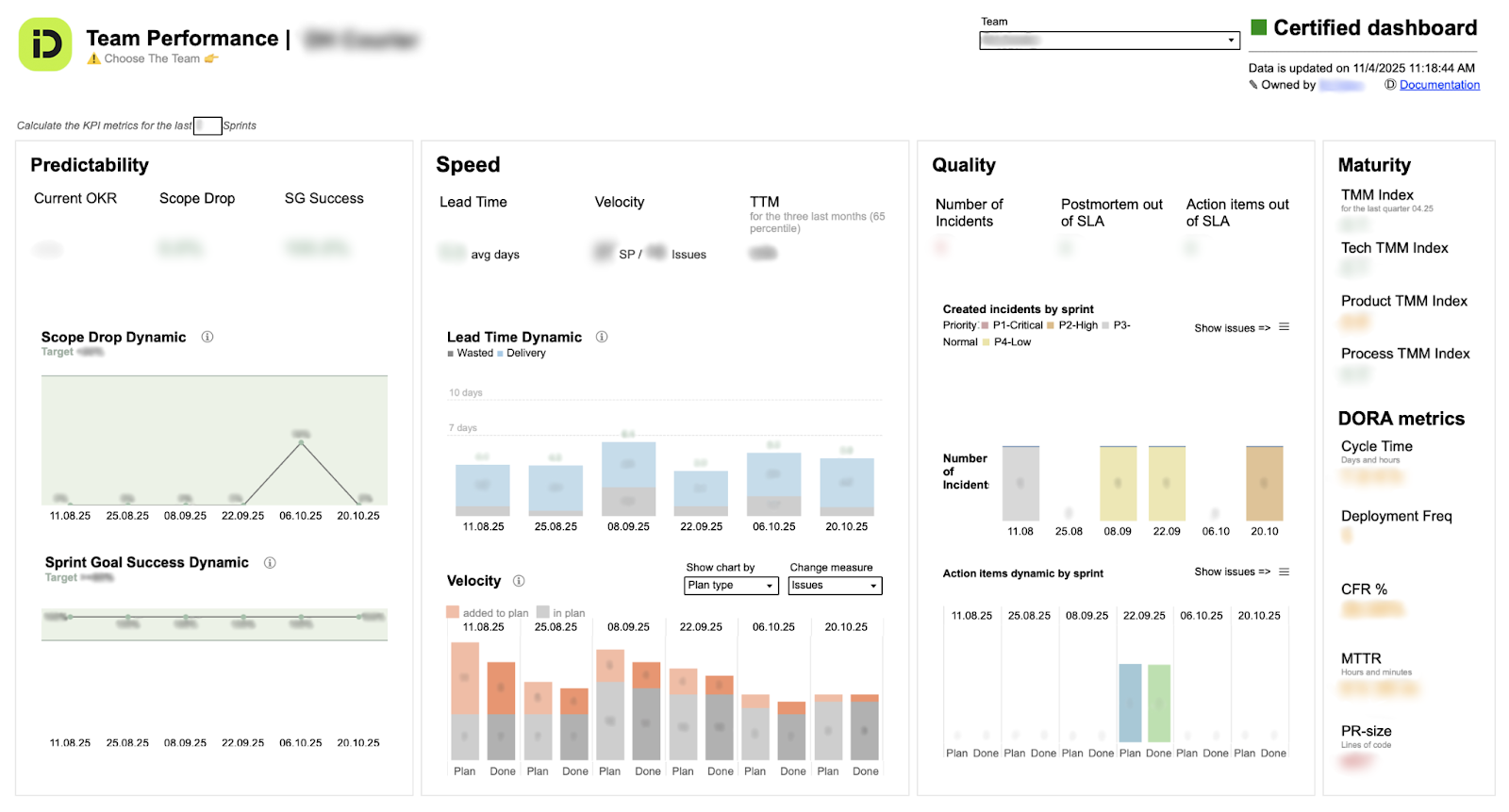 Roles: each metric has an owner (SME) – a subject-matter expert responsible for defining the methodology and leading the implementation of new processes and metrics. In addition, managers are accountable for performance within their teams, clusters, or division. For us, it’s essential that metrics are part of a manager’s daily work, not delegated to dedicated roles like Agile Coaches, Service Delivery Managers, or Project Managers. Only this way can we achieve systemic and sustainable results.