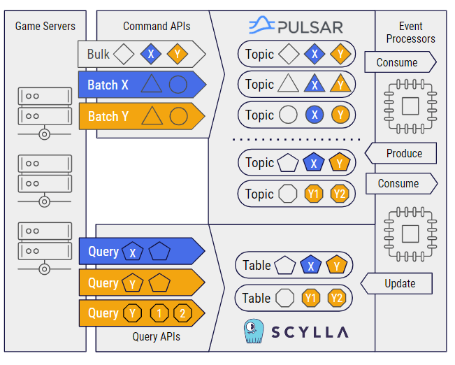 In this blog, we share our experience of building this real-time event-driven analytics system. First, we’ll explore why we built our service architecture based on Command and Query Responsibility Segregation (CQRS) and event sourcing patterns with Apache Pulsar and ScyllaDB. Next, we’ll look at how we use ScyllaDB to solve the problem of dispatching events to numerous gameplay sessions. Finally, we’ll cover how we use ScyllaDB keyspaces and data replication to simplify our global data management.