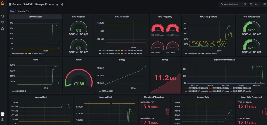The Intel XPU Manager provides a command-line interface and various APIs to assist in GPU discovery and associated information reporting. It also supports GPU firmware updating, GPU topology / grouping, various telmetry and health capabilities, and configuring various GPU policies and settings. Via API integration with Grafana and other software, it can make for some pretty powerful reporting and management capabilities: