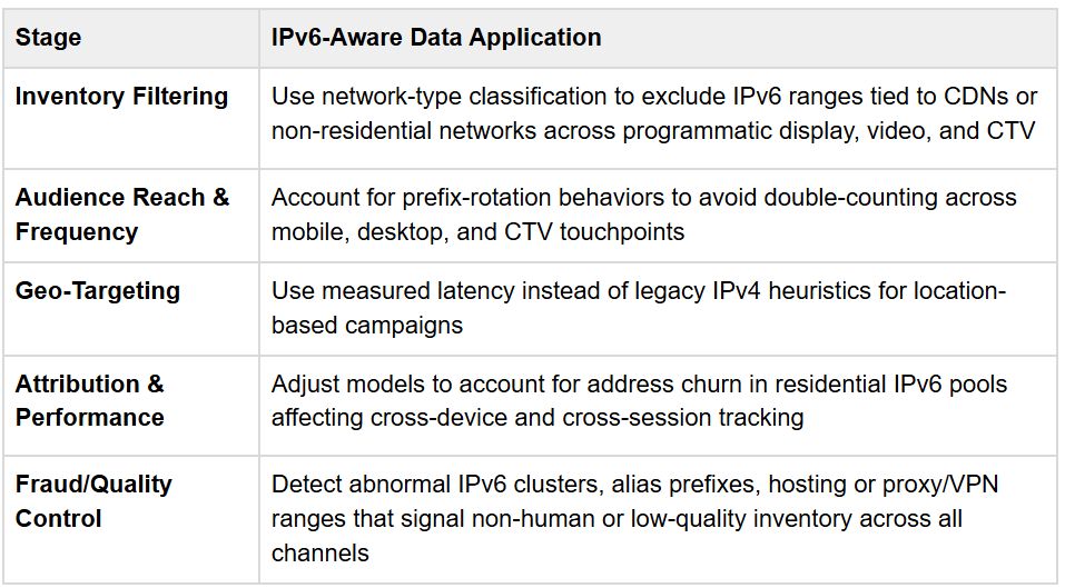 Whether you’re buying CTV, mobile, display, or video, newly allocated residential IPv6 blocks are classified correctly from day one, not months later when legacy databases finally catch up.