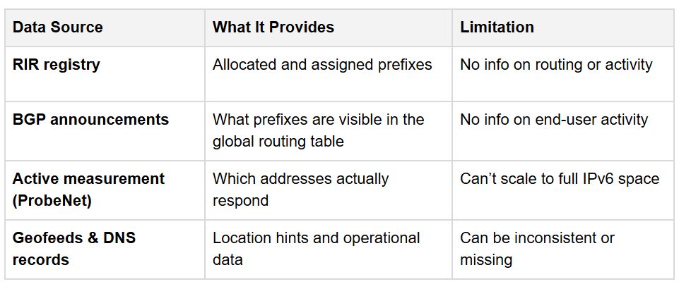 Unlike providers who simply catalog IPv6 allocations from public registries, IPinfo continuously measures and validates active IPv6 networks, combining registry coverage with large-scale measurement evidence. This approach makes IPinfo one of the few companies providing IPv6 data grounded in real, observable internet behavior, not just static records.