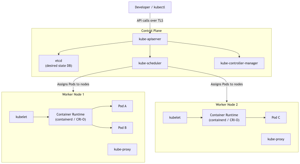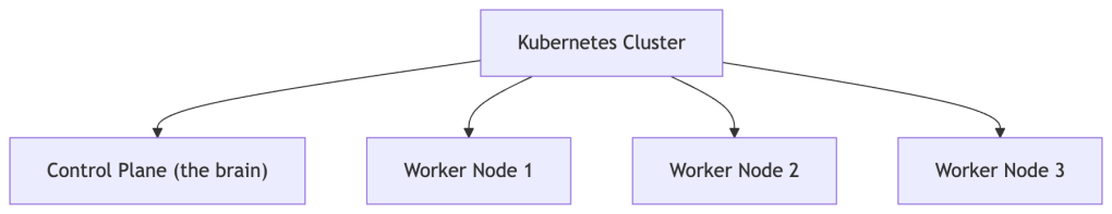 • Control Plane node — the brain. It makes decisions about the cluster and stores desired state.