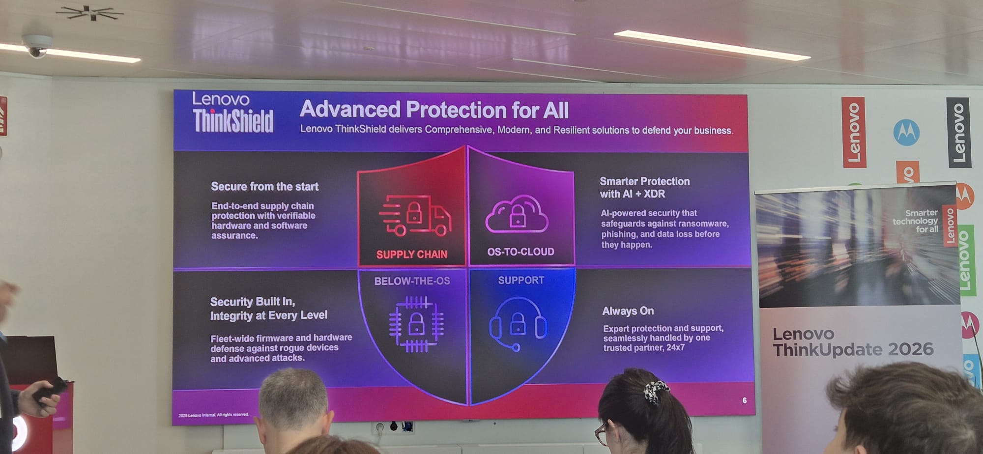 The security platform ThinkShield It also occupied a prominent part of the presentations. Its advanced protection proposal is articulated in four pillars: supply chain protection with verifiable hardware and software; fleet-level firmware defense against advanced devices and attacks; intelligent security with AI and XDR to protect against ransomware, phishing and data loss before they happen; and ongoing expert support. All this covering from below-the-OS to the cloud under a single trusted provider.