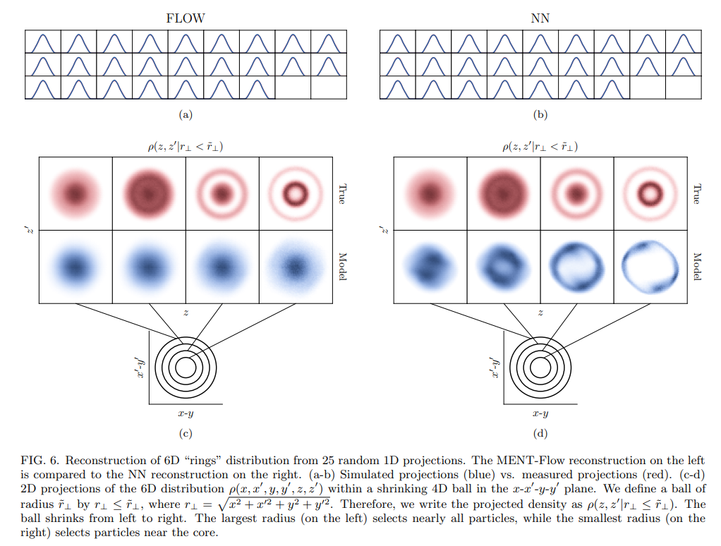 In conclusion, MENT-Flow is a promising approach to high-dimensional phase space tomography. Numerical experiments demonstrate consistency with known 2D maximum-entropy solutions and the ability to fit complex 6D distributions to large measurement sets. In the 6D tests, although there are no available benchmarks, we found that entropic regularization pulls the solution closer to the prior. Thus, MENT-Flow is an effective way to incorporate prior information in high-dimensional reconstructions. Our numerical experiments also emphasize the potential importance of uncertainty quantification in high-dimensional tomography, as we found that some distributions can only be reconstructed from large numbers of 1D measurements. Future work should apply MENT-Flow to more realistic distributions, accelerator