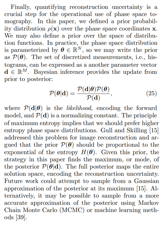 Second, an interesting application of maximum-entropy tomography is to intense hadron beams, in which particles respond to both applied and self-generated electromagnetic fields. Phase space tomography is a significant challenge for such beams because the forward process depends on the unknown initial distribution. We do not know if the maximum-entropy distribution is unique in this case. Including space charge in the GPSR forward process may be possible using differentiable space charge solvers [38].