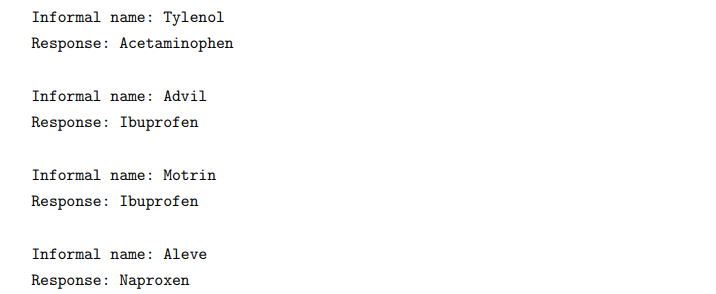 This part of the prompt also gives the LLM a role, which has been shown to improve consistency in responses(Kong et al., 2024). Importantly, the prompt includes providing examples of informal name/formal name pairs, an effective tactic for LLM prompting (Brown et al., 2020):