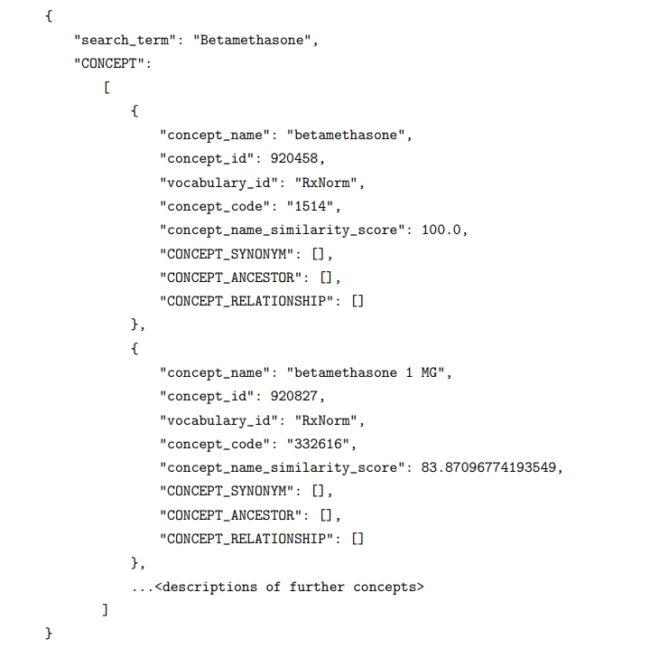 The omopoutput event contains the searchterm sent to the OMOP-CDM, then a CONCEPT array, where each item is a match meeting the threshold set on fuzzy string matching. Each item describes the conceptname, conceptid, vocabularyid, and conceptcode from the OMOP-CDM’s concept table, followed by the conceptnamesimilarity_score calculated in Llettuce. Llettuce also has the option to fetch further information from the OMOP-CDM, not enabled in the default configuration, which is included in the entry for each concept.