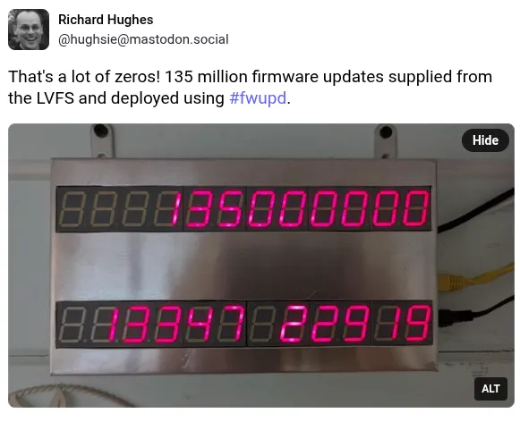 Fwupd/LVFS lead developer Richard Hughes of Red Hat celebrated the monumental milestone of 135 million firmware updates being supplied by LVFS and deployed using the Fwupd software.