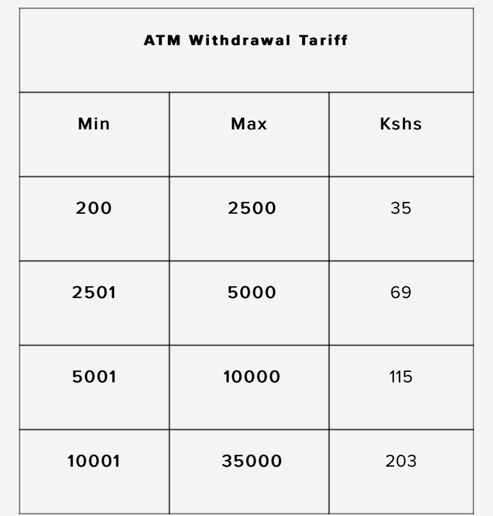While convenient, ATM withdrawals cost slightly more in some cases, especially for amounts between Ksh 2,500 and Ksh 35,000.