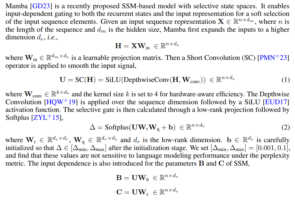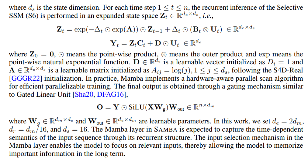 We explore different hybridization strategies consisting of the layers of Mamba, Sliding Window Attention (SWA), and Multi-Layer Perceptron [Sha20, DFAG16]. We conceptualize the functionality of Mamba as the capture of recurrent sequence structures, SWA as the precise retrieval of memory, and MLP as the recall of factual knowledge. We also explore other linear recurrent layers including Multi-Scale Retention [SDH+23] and GLA [YWS+23] as potential substitutions for Mamba in Section 3.2. Our goal of hybridization is to harmonize between these distinct functioning blocks and find an efficient architecture for language modeling with unlimited-length extrapolation ability.