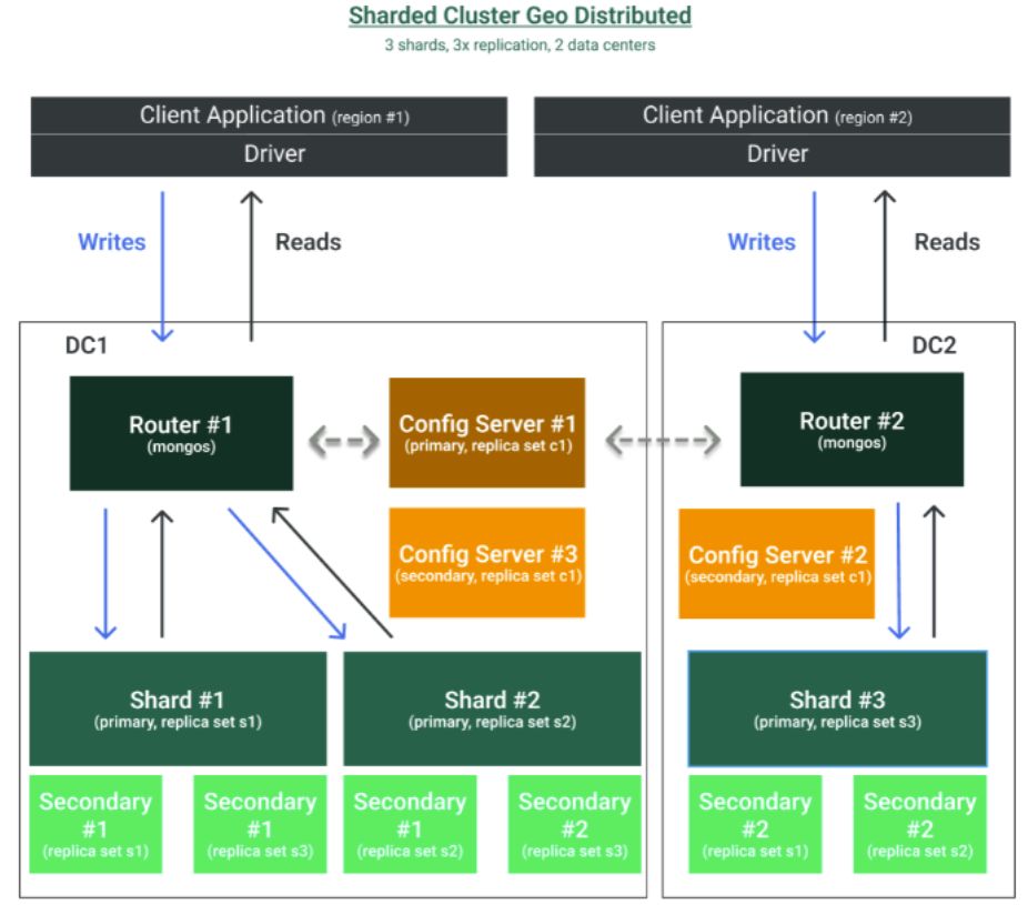 Also, sharded clusters can be deployed in a geo-distributed setup to overcome data center failures, as depicted in the following figure.