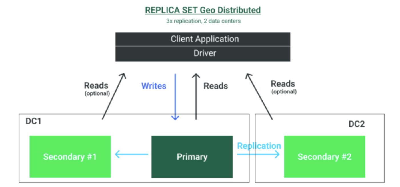 Regarding geo-distribution, MongoDB supports geo-distributed deployments for replica sets to ensure high availability in case of data center failures. In this context, secondary instances can be distributed across multiple data centers, as shown in the following figure. In addition, secondaries with limited resources or network constraints can be configured with a priority to control their electability as primary in case of a failure.