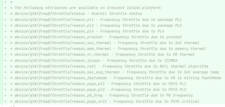 In particular, there is improved work around GT throttling and extending the performance limit reasons bits to support Crescent Island. Intel’s performance limit reasons functionality for their CPUs and GPUs can indicate to user-space why the hardware is needing to down-clock or otherwise limited performance. Crescent Islands adds some new performance limit reason options that are now recognized by the driver: