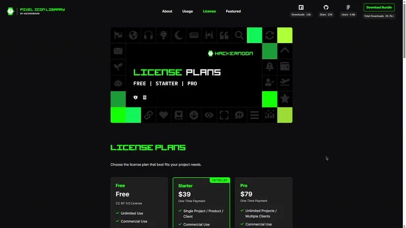 The Free plan (CC BY 4.0) lets you use the icons anywhere – personal or commercial – but you must give credit. The Starter plan removes attribution and covers one project or product. The Pro plan removes attribution too but lets you use the icons across multiple projects or clients.