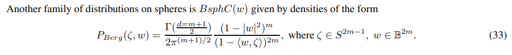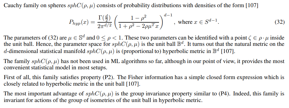 Functions of the form (32) are Poisson kernels for the hyperbolic Dirichlet problem [85]. On the other side,(33) are Poisson kernel in the Bergman metric. To our best knowledge, none of these densities have never been applied in ML so far.