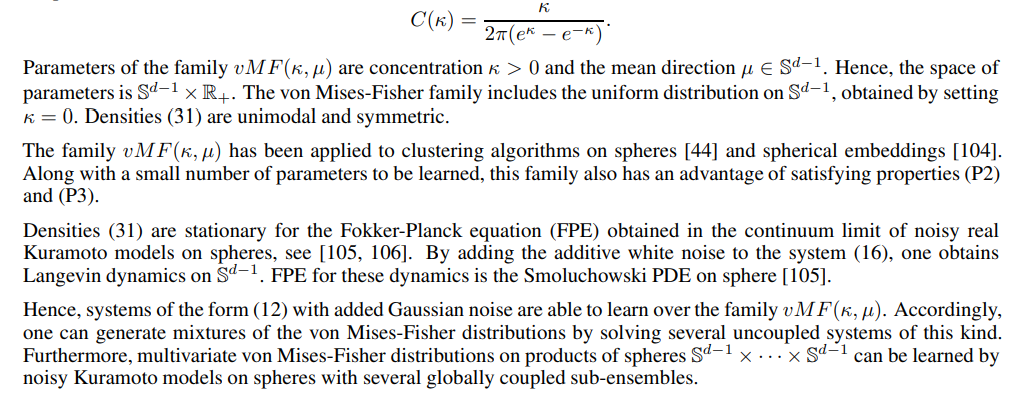 The von Mises-Fisher family vMF(κ, µ) is the most popular statistical model for ML algorithms over spheres [44, 102, 103, 104]. The only alternative model used so far is provided by the family of Bingham distributions. In addition, there are a couple of papers experimenting with other (that is – different from von Mises-Fisher and Bingham) options.