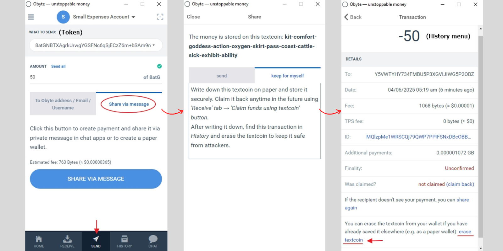 Like a truly decentralized and self-custodial crypto wallet, Obyte offers private keys to its users. In this case, they’re twelve random words you must write down and store offline. There’s no other way to access your wallet without them. Additionally, if you want to store part of your funds offline for security reasons, you can create a textcoin (basically, another private key) with them inside, and then delete it from the History in the wallet.