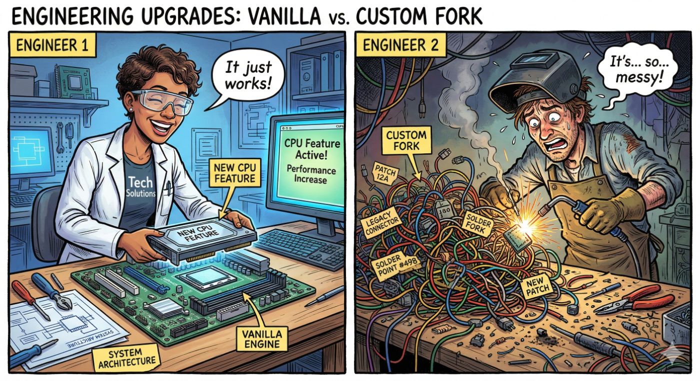 If you hack the engine’s internals, you’re signing up for a never-ending maintenance loop. Every time a new version drops with support for fresh hardware—like ARM KleidiAI (57% prefill boost) or Intel DL Boost (VNNI) — you’d have to re-port your custom optimizations manually. By sticking with a Vanilla Inference Engine, I can “catch” these hardware updates for free just by bumping a version number.
