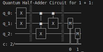• The M boxes then measure the final states. The top qubit will always be ‘1’, while the bottom qubit will randomly collapse to ‘0’ or ‘1’ (50% chance each).