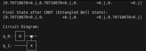 • The H gate on q_1 creates superposition, meaning the qubit exists as both ‘0’ and ‘1’ simultaneously.