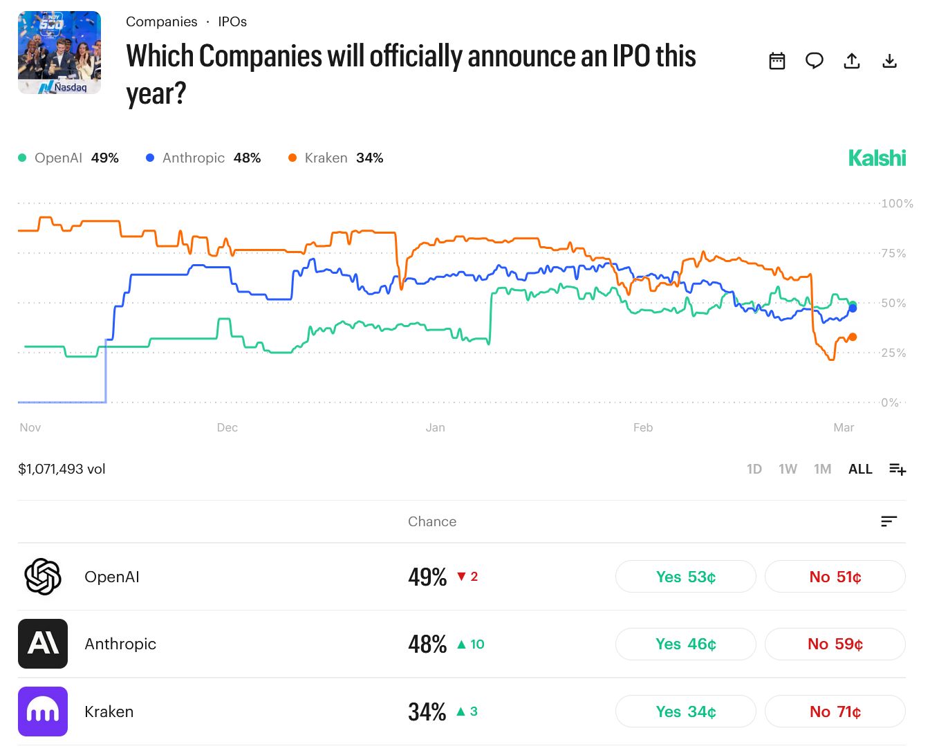 Over at Kalshi, users are betting whether OpenAI and/or Anthropic will go public this year (or next!). What do you think?